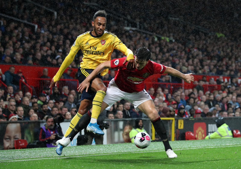 Arsenal's Pierre-Emerick Aubameyang (left) and Manchester United's Harry Maguire battle for the ball during the English Premier League soccer match between Manchester United and Arseanl at Old Trafford on Sept 30, 2019.