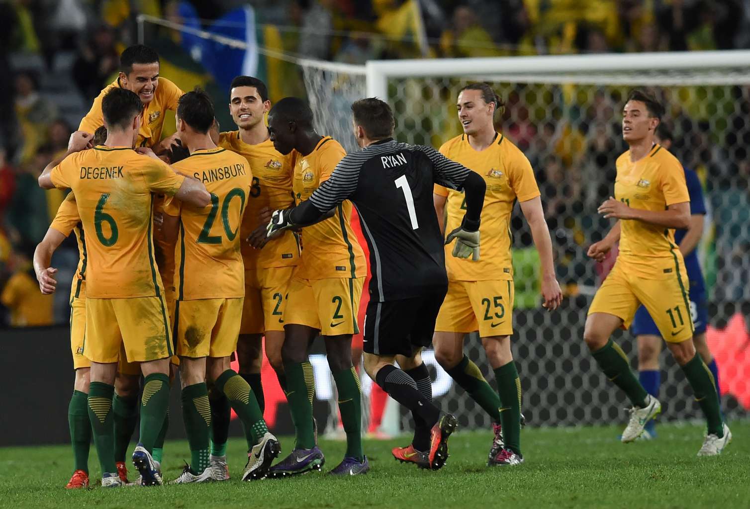 Australia's players celebrate a goal against Greece during their international friendly football match in Sydney on June 4, 2016.