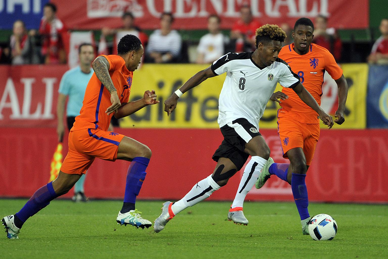 Austria's David Alaba (center) vies with Kenny Tete (left) and Riechedly Bazoer of the Netherlands during the Euro 2016 friendly football match at Ernst Happel stadium in Vienna, Austria, on June 4.