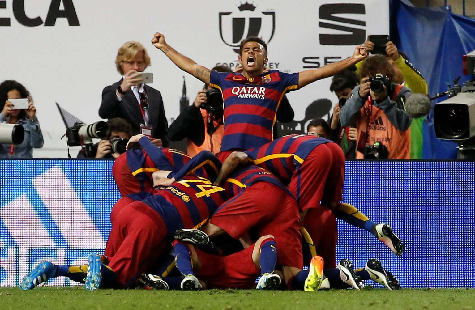 Jordi Alba celebrates with team mates after scoring the first goal for Barcelona.
