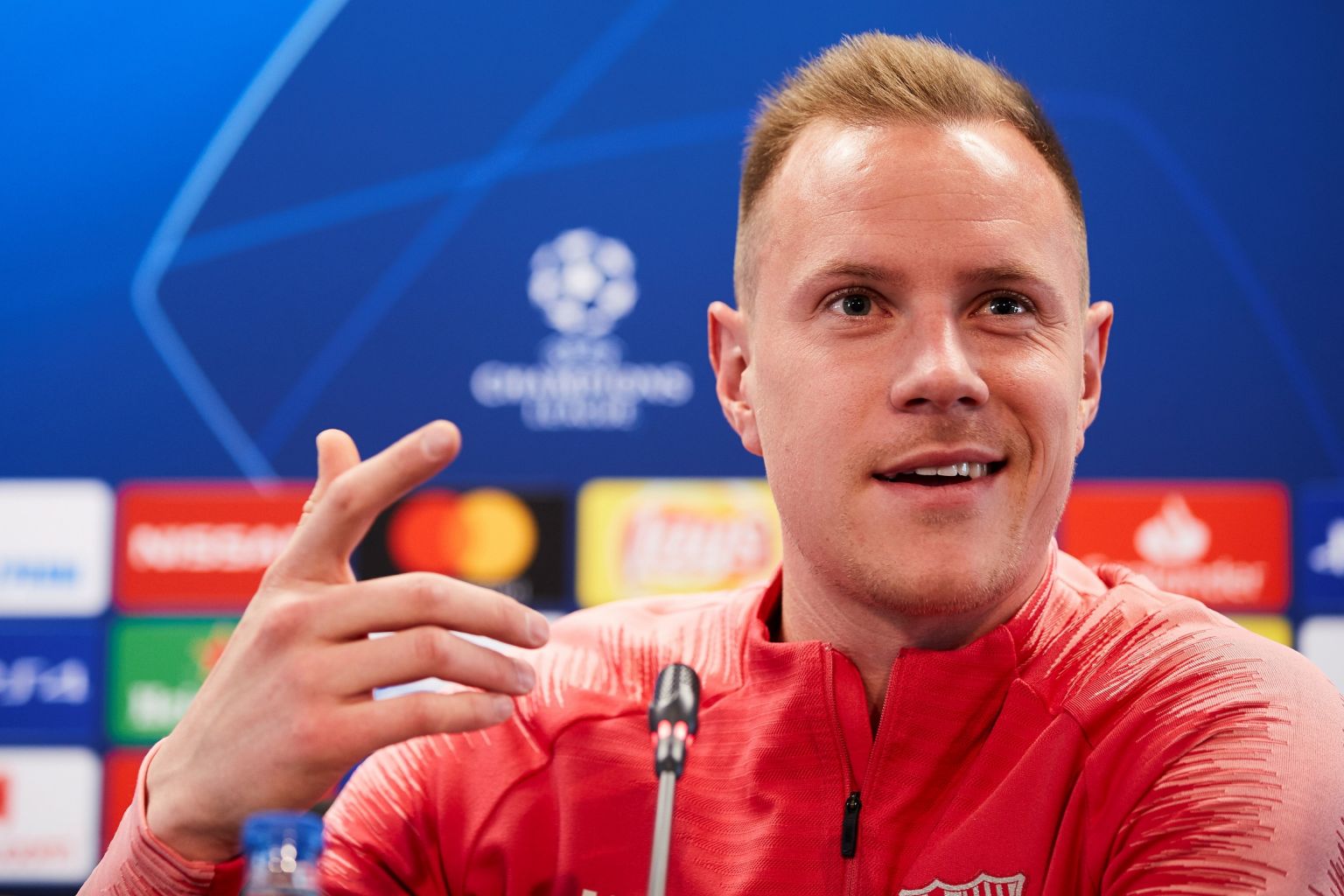 Marc Andre ter Stegen attends a press conference ahead of the match.