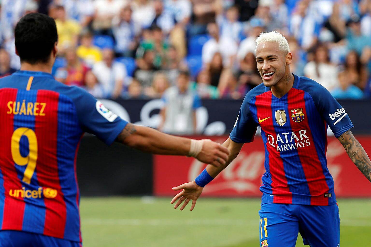 Neymar celebrates a goal with team-mate Luis Suarez.