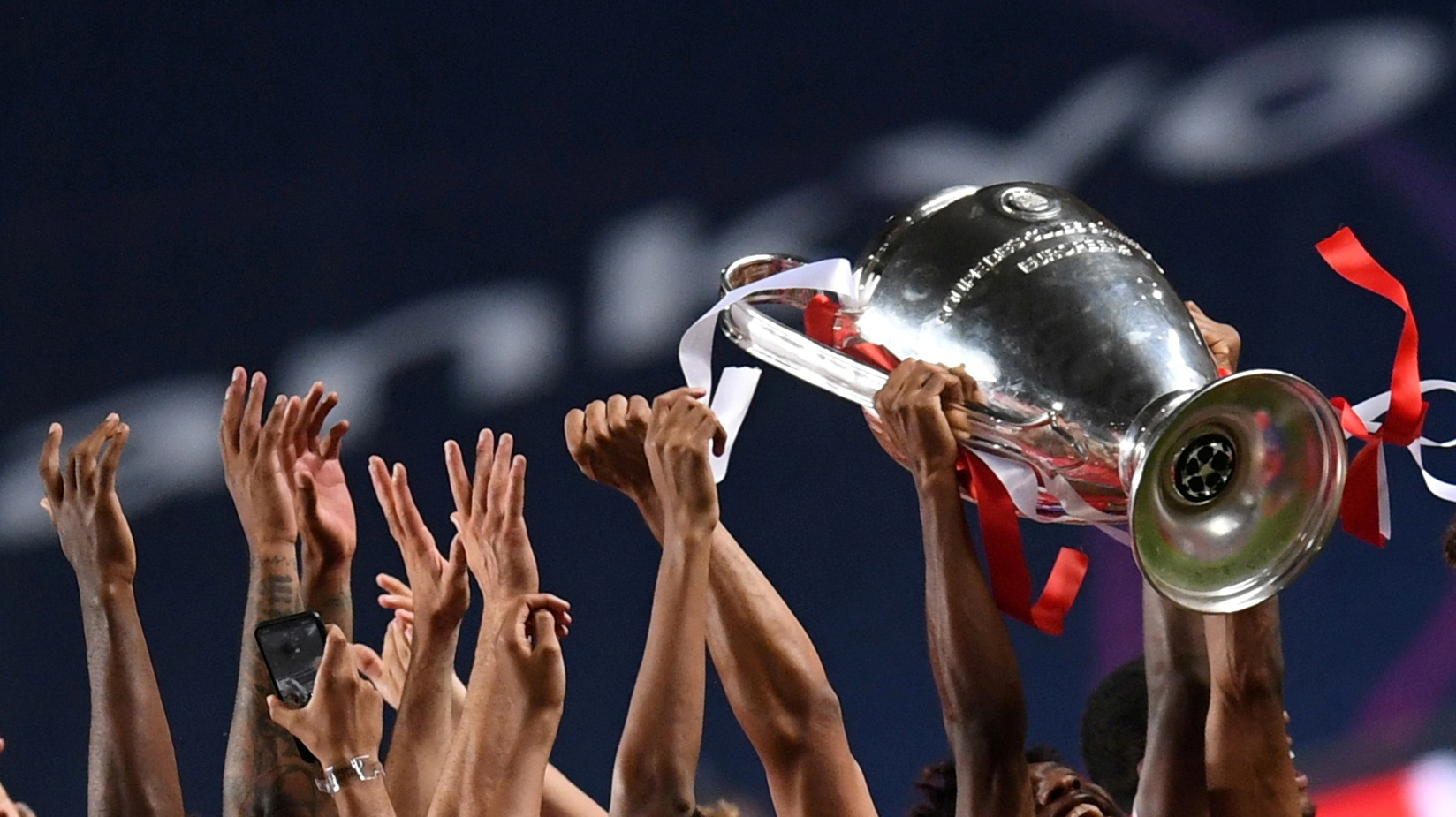A 2020 photo shows Bayern Munich celebrating winning the Champions League with the trophy.