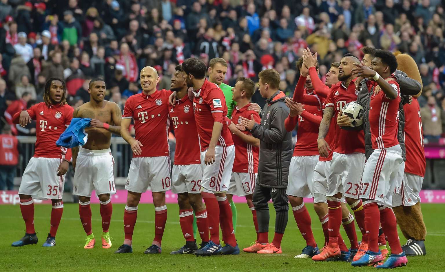 Players of Bayern Munich walk over the pitch after winning their German first division Bundesliga football match against Hamburger SV in Munich, on Feb 25, 2017.