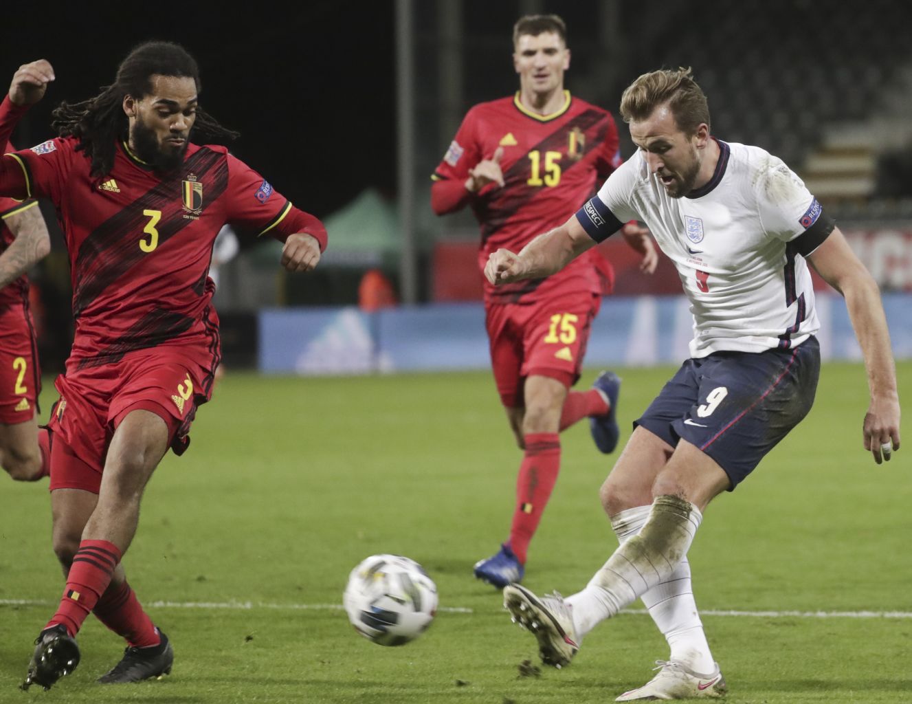 Harry Kane of England and Jason Denayer of Belgium in action.