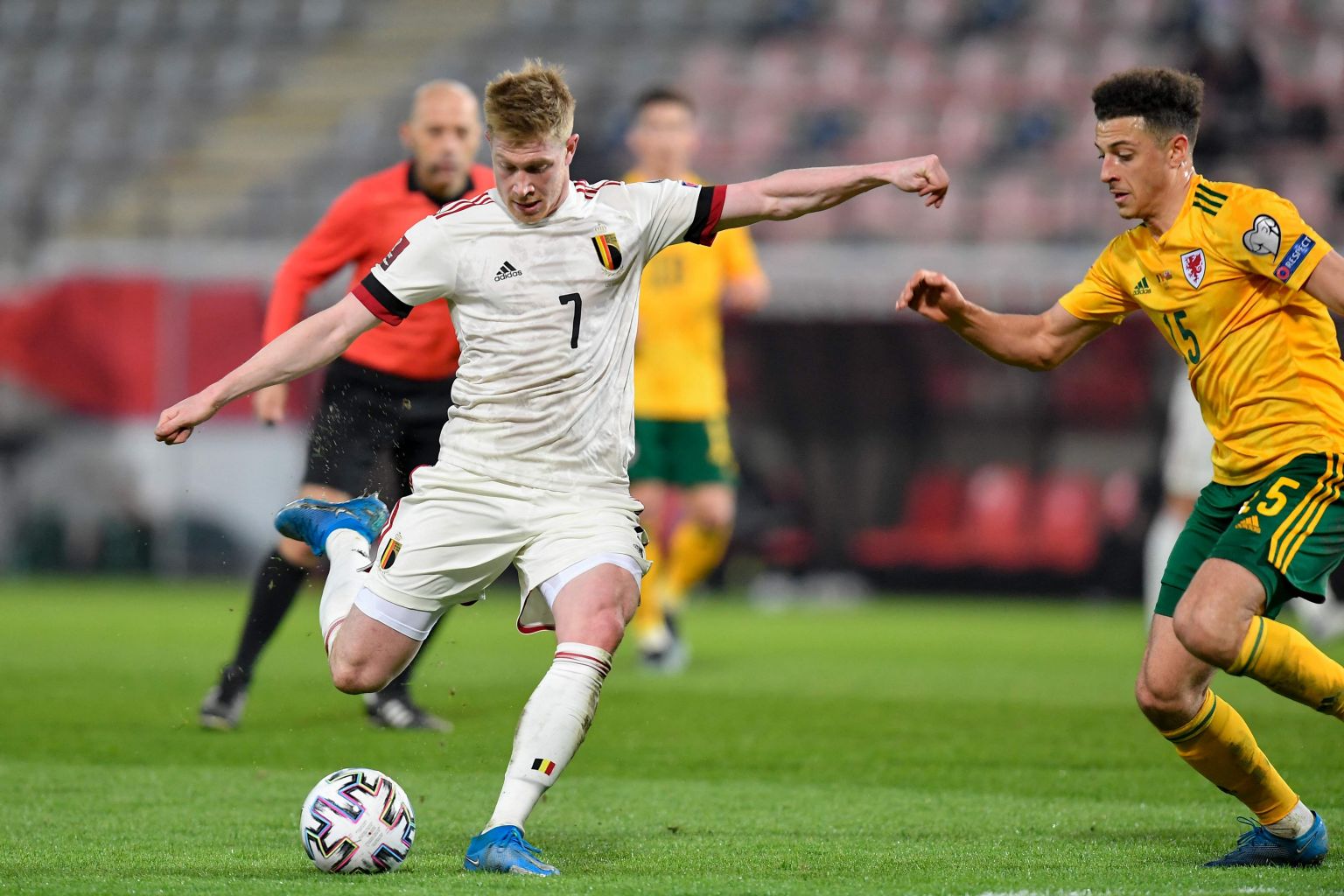 Belgium's Kevin De Bruyne (left) kicks the ball during the World Cup qualification football match against Wales, on March 24, 2021.
