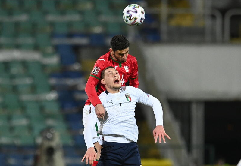 Italy's Andrea Belotti (front) fights for a high ball with Bulgaria's Daniel Dimov in Sofia, Bulgaria, on March 28, 2021.