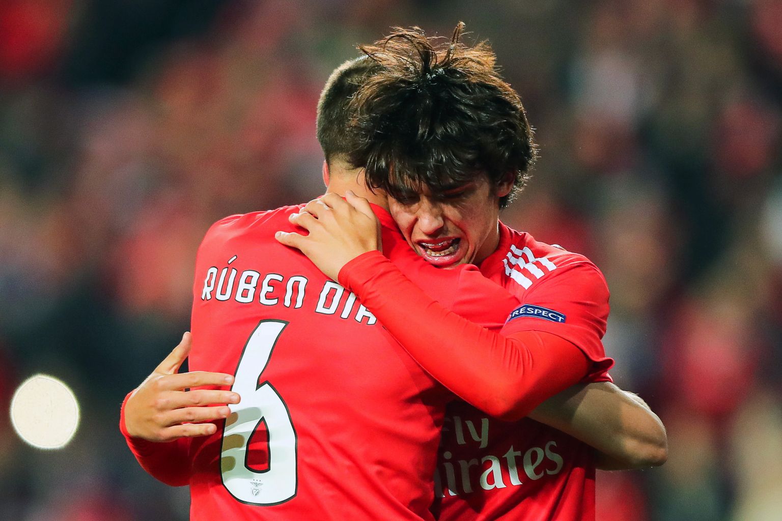 Felix (right) celebrates a goal with his team mate Ruben Dias.