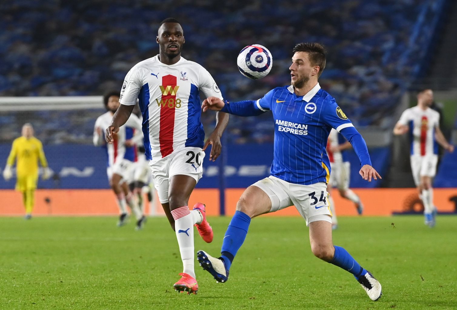 Brighton & Hove Albion's Joel Veltman in action with Crystal Palace's Christian Benteke, on Feb 22, 2021.