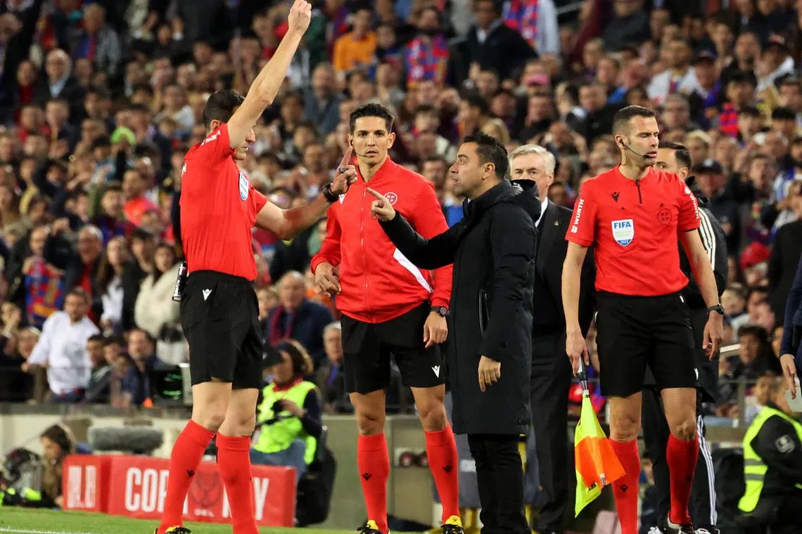 Barcelona coach Xavi (in black) is shown a yellow card by referee Jose Luis Munuera during the match.