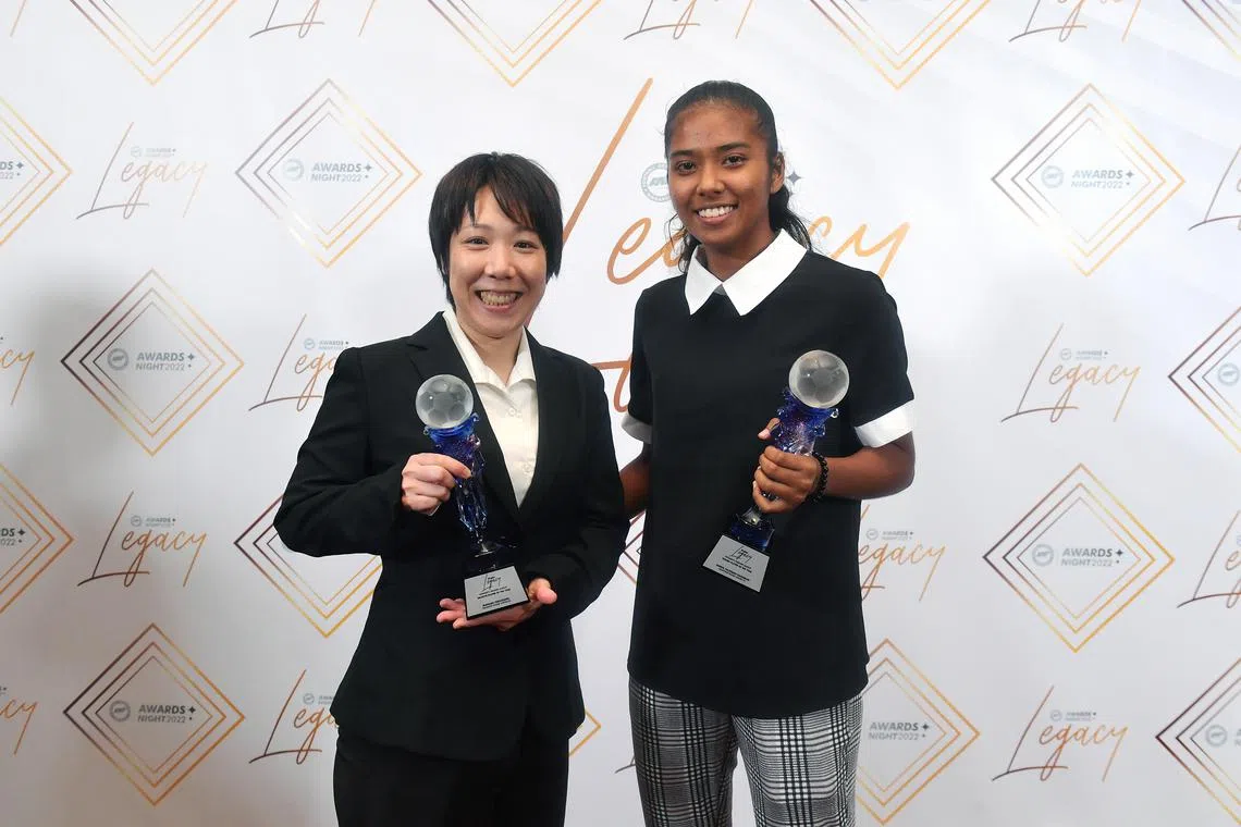 Tanjong Pagar United’s Manami Fukuzawa (left), who was named the WPL Player of the Year, and her teammate Haziqah Haszman, who won the league’s Young Player of the Year award.