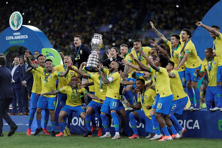 Brazil's national football team celebrating their Copa America win with the trophy on July 7, 2019. They are set to play two friendlies at Singapore's National Stadium next month.