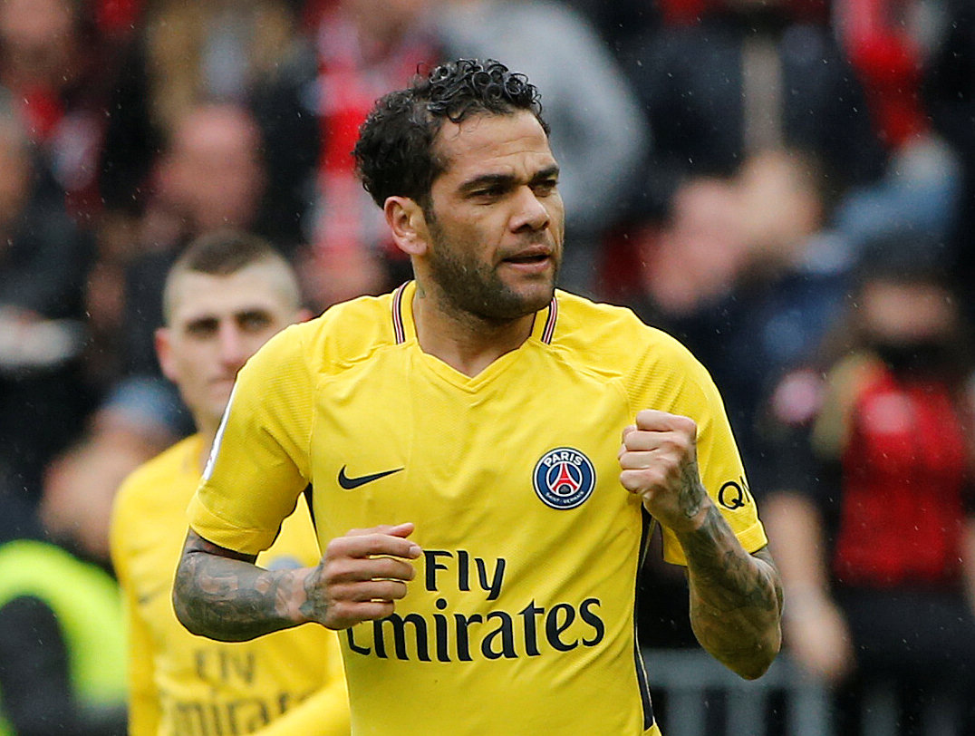 Dani Alves celebrates a goal for Paris Saint-Germain.