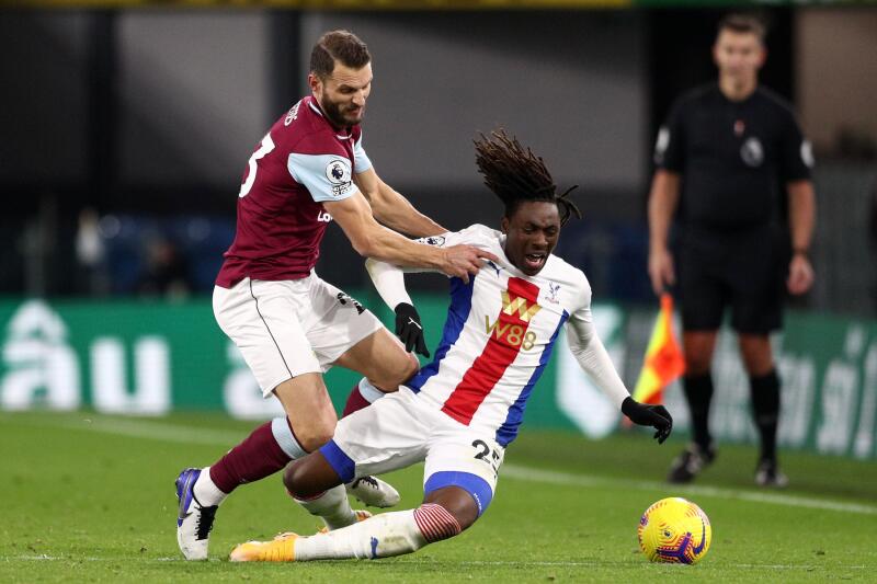 Burnley's Dutch defender Erik Pieters (left) vies with Crystal Palace's English midfielder Eberechi Eze on Nov 23, 2020.