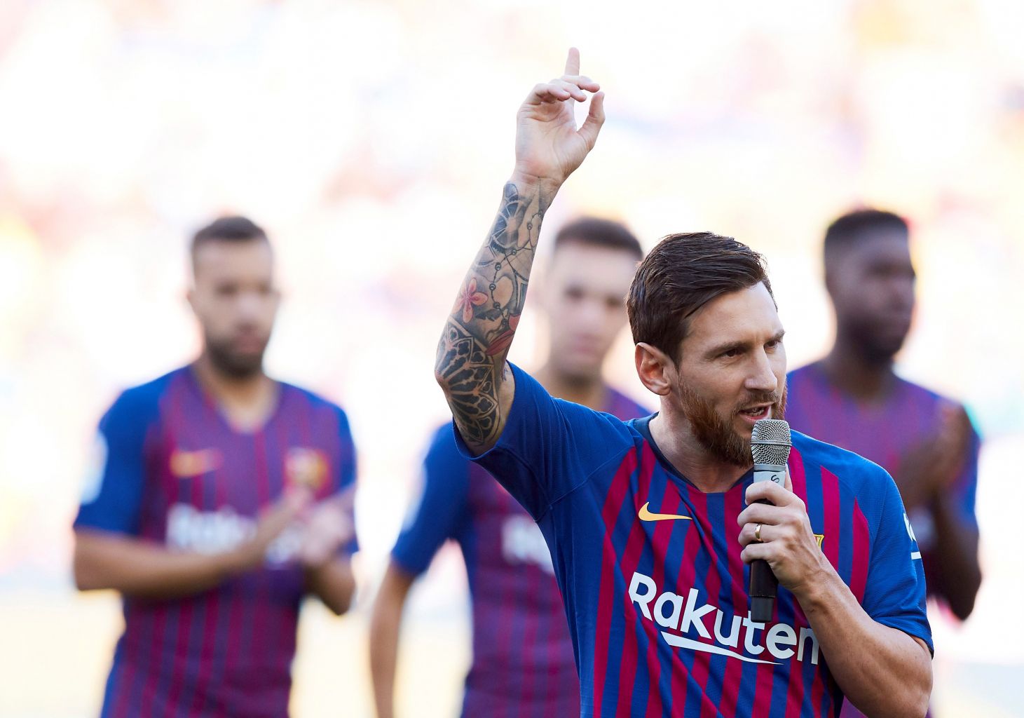 Messi (centre) talking at Camp Nou Stadium in Barcelona in Aug 15, 2018.