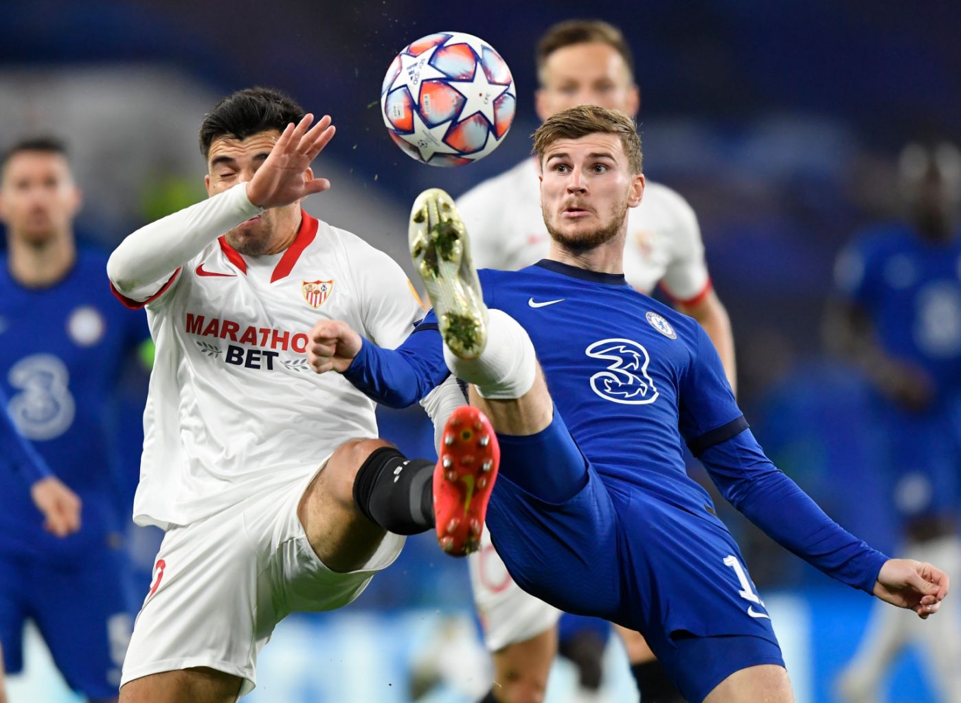 Chelsea's Timo Werner (right) in action against Sevilla's Marcos Acuna (left).