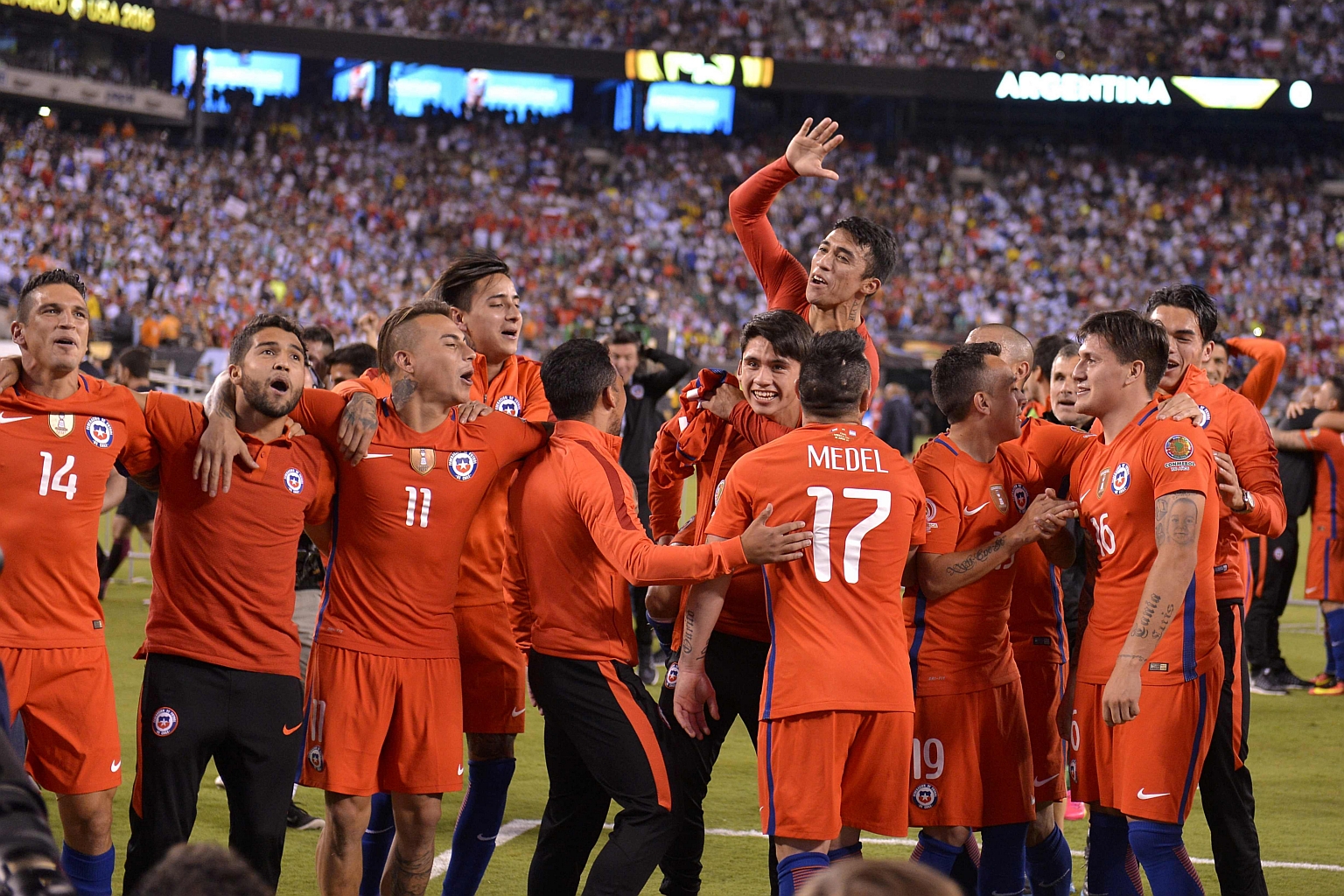 Chile's players celebrate after defeating Argentina in the penalty shoot-out and winning the Copa America Centenario final.