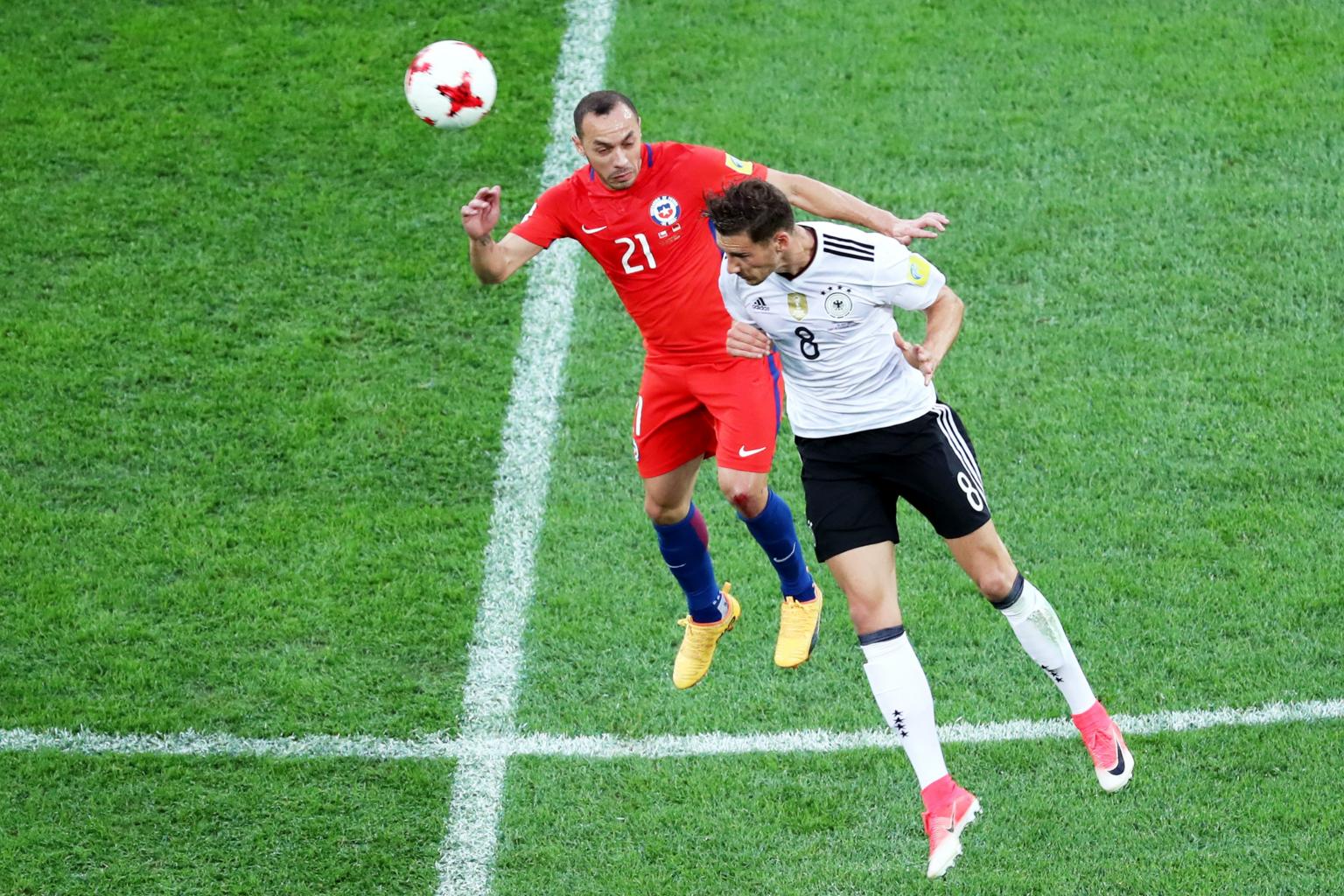 Marcelo Diaz of Chile (left) in against Leon Goretzka of Germany during the FIFA Confederations Cup 2017 final match between Chile and Germany at the Saint Petersburg stadium in St.Petersburg, Russia on July 2, 2017.