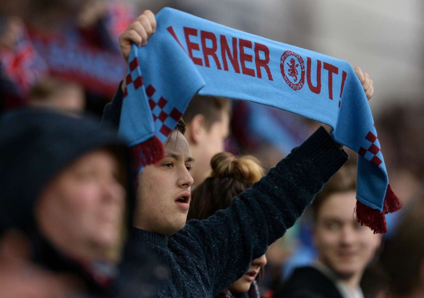 A fan holds a scarf reading "Lerner Out" in reference to Aston Villa's US chairman Randy Lerner in March 2016.