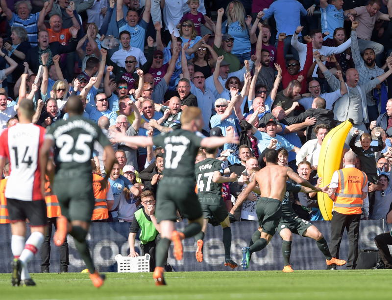 Manchester City's Gabriel Jesus (shirtless) scores their first and last minute winning goal against Southampton during their Premier League match at St Marys stadium, Southampton, Britain, on May 13, 2018.