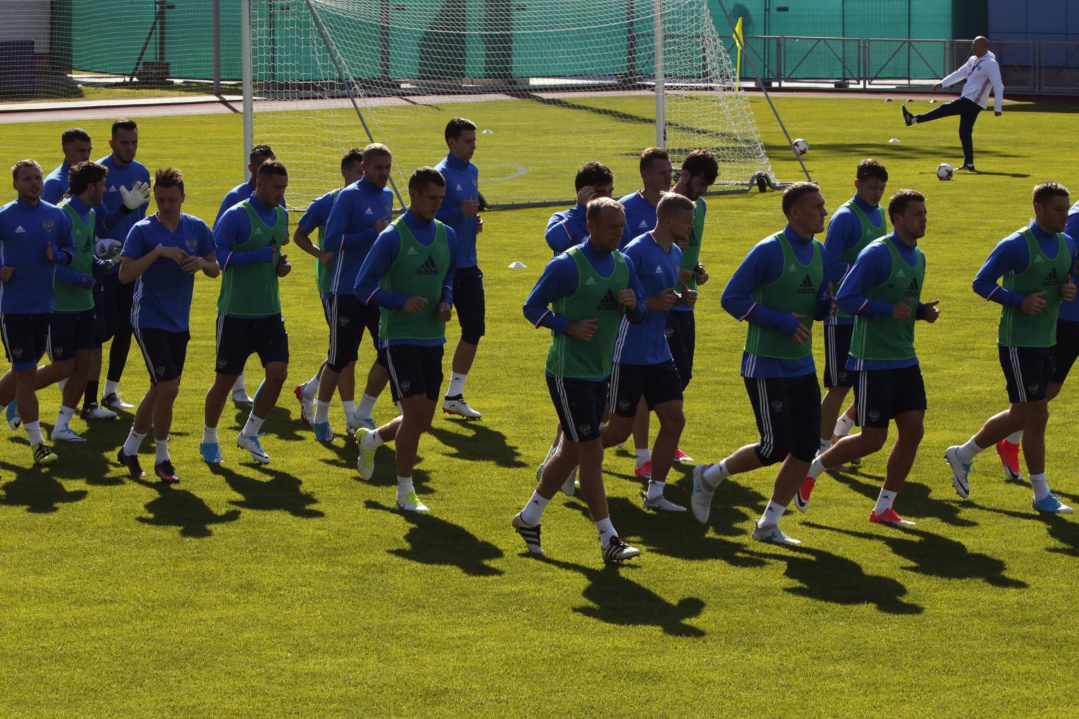 Russian national soccer team players in action during a training session at Smena stadium in St. Petersburg, Russia on June 16, 2017.