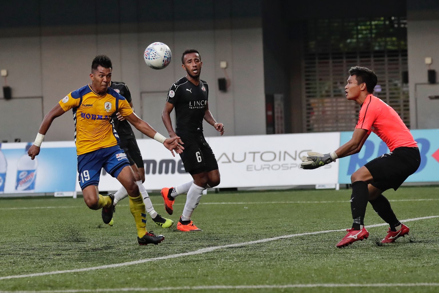 Tampines Rovers’ Khairul Amri (left) challenges Home United’s goalkeeper Kenji Rusydi (right) for the ball during the Singapore Premier League match at Our Tampines Hub on Sept 29, 2018.