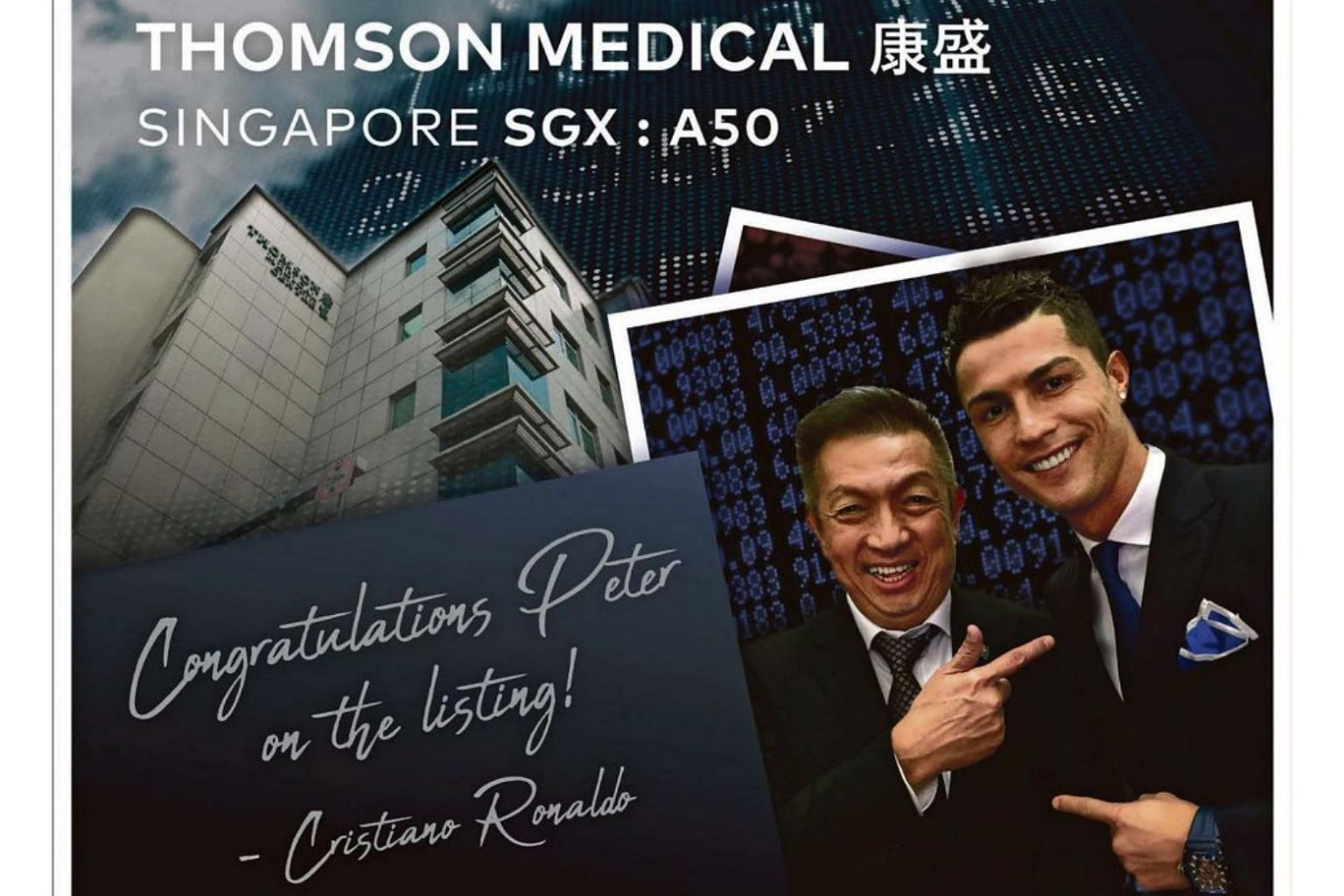 The half-page advertisement read: "Congratulations Peter on the listing! - Cristiano Ronaldo", in reference to healthcare player Thomson Medical Group's listing on the Singapore Exchange (SGX).