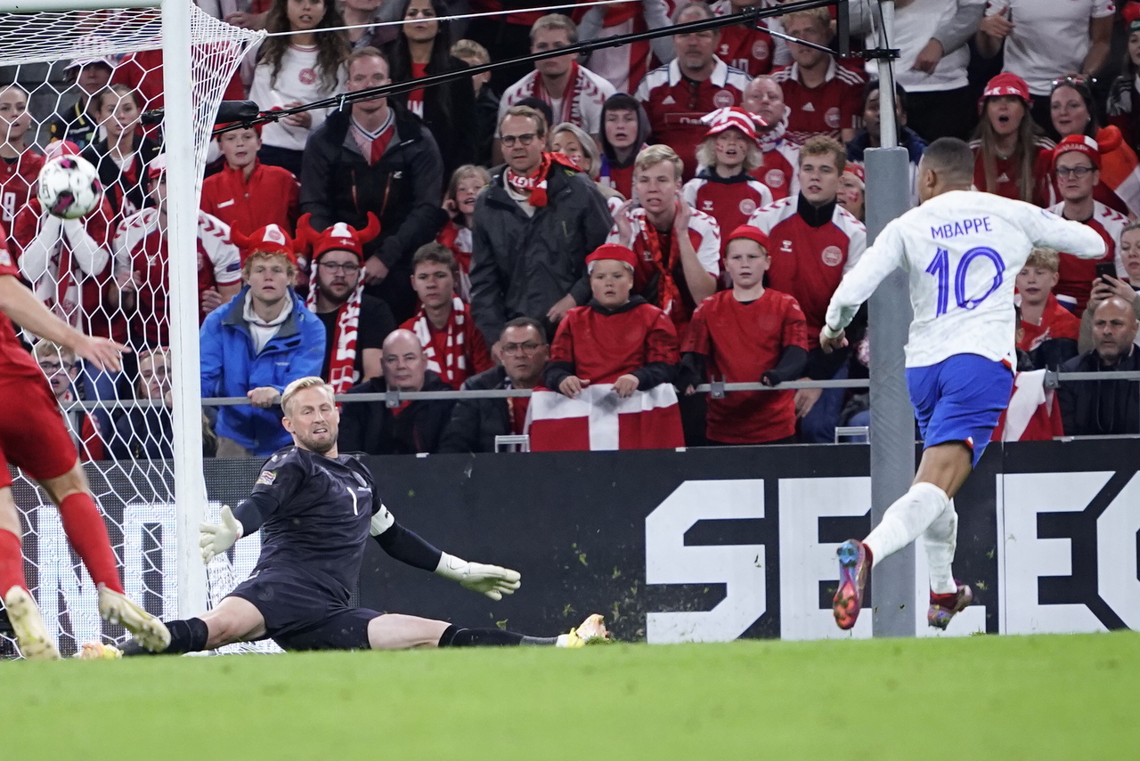 Denmark's goalkeeper Kasper Schmeichel (left) saves a shot from France's Kylian Mbappe in Copenhagen, Denmark, on Sept 25, 2022.