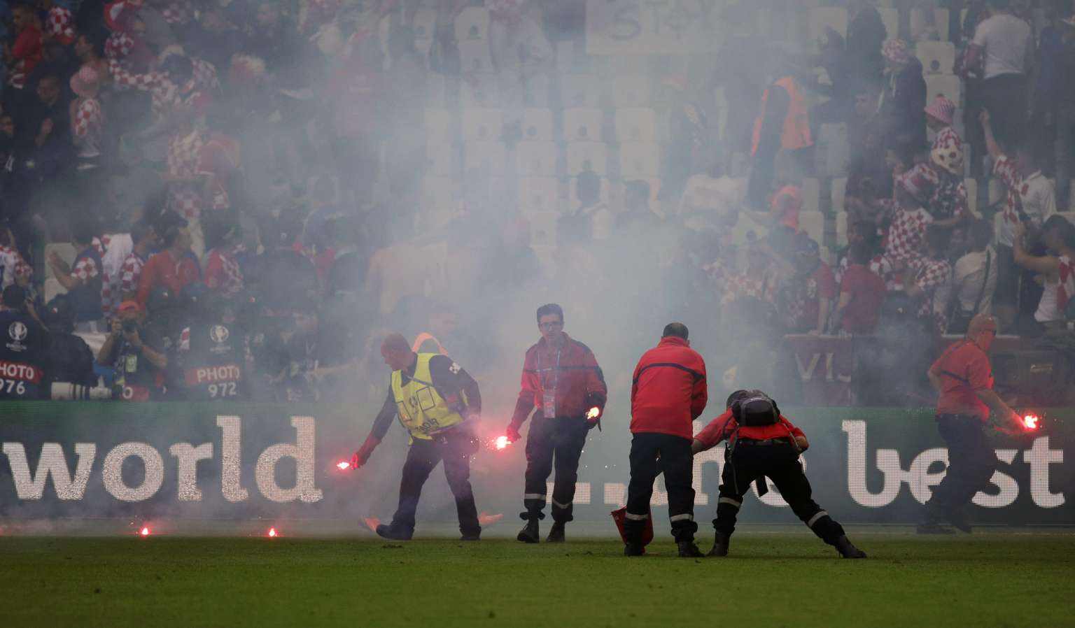 The Croatia game in St Etienne was held up for several minutes after its fans threw flares onto the pitch and began fighting among themselves.