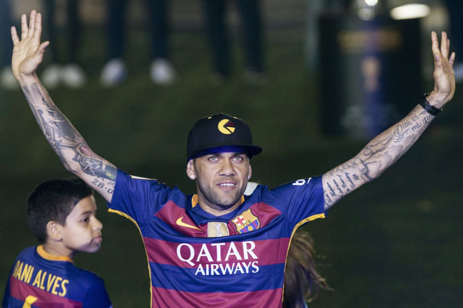 Barcelona's defender Dani Alves celebrates after winning the Spanish First Division League and King's Cup competitions at Nou Camp stadium in Barcelona, on May 23, 2016.