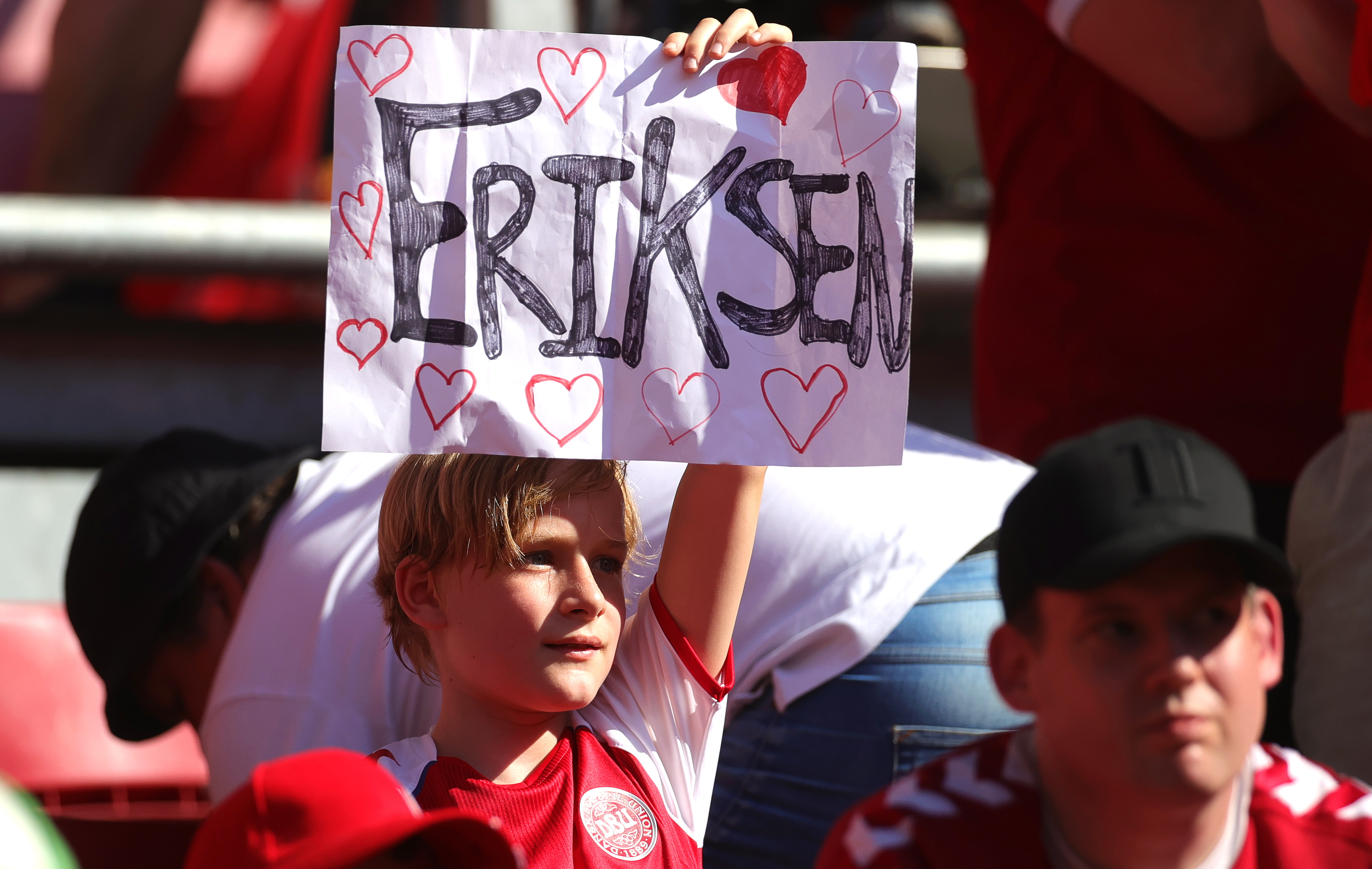 Fans held up messages of support for Denmark's Christian Eriksen during the team's match against Belgium..