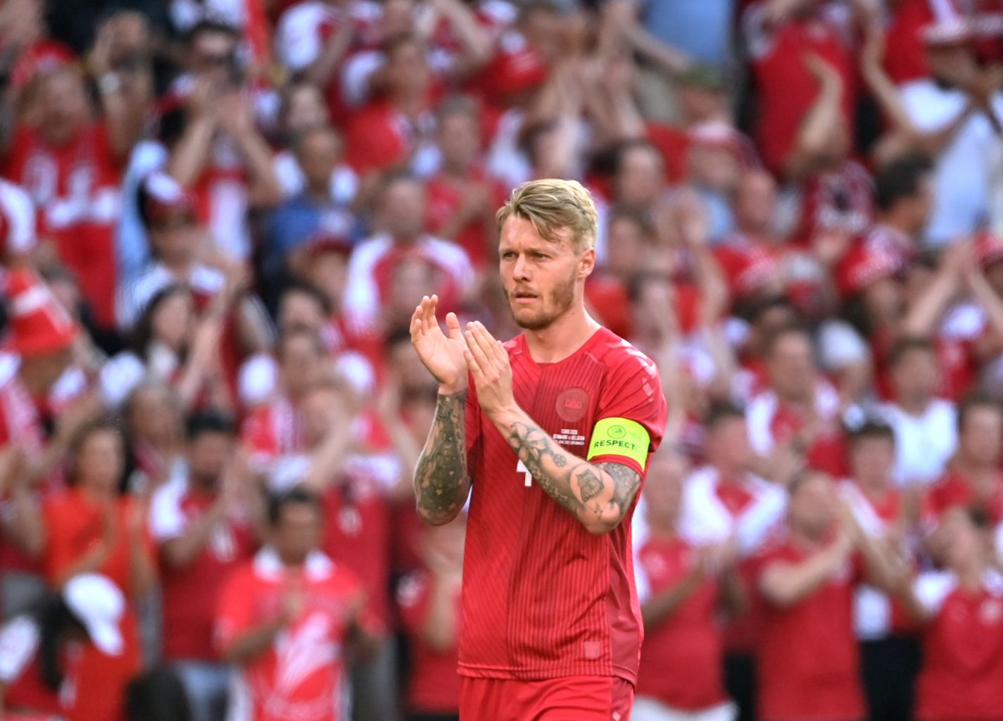 Denmark's Simon Kjaer reacts after kicking the ball out in the 10th minute of the match to applaud hospitalised teammate Christian Eriksen.