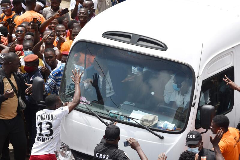 Supporters greet Didier Drogba (inside bus) after the submission of his candidacy for next month's Ivory Coast Football Federation elections.