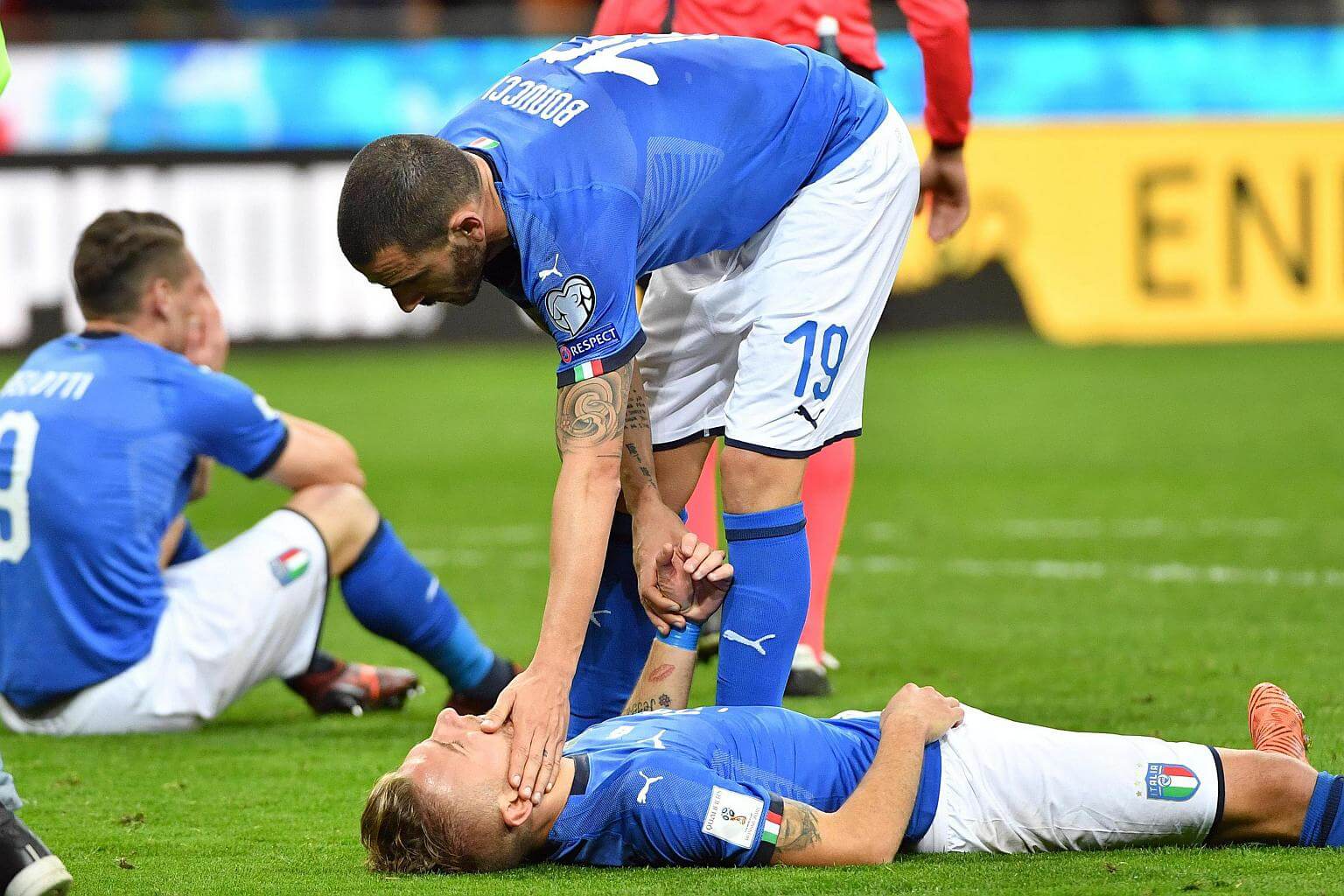 Italy's defender Leonardo Bonucci and teammate forward Ciro Immobile show their dejection at the end of the match.