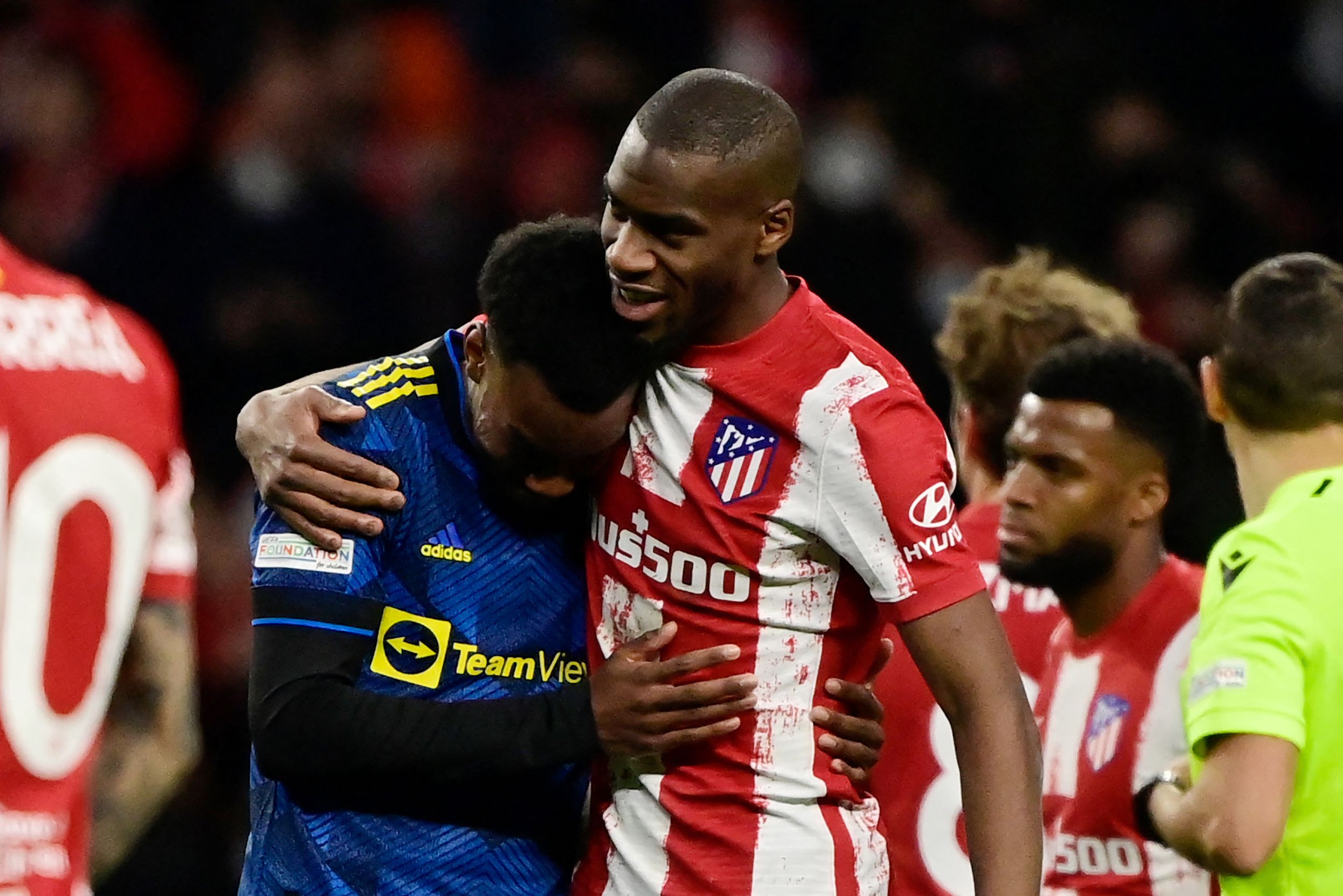 Manchester United's Anthony Elanga (left) and Atletico Madrid's Geoffrey Kondogbia hug at the end of the match.