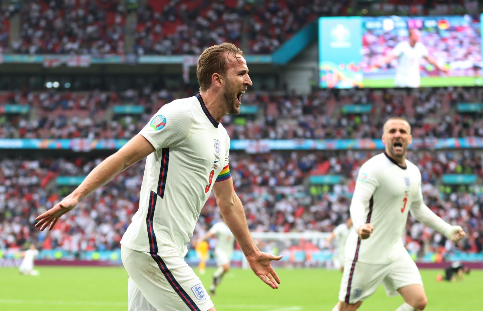 Harry Kane celebrates scoring England's second goal.