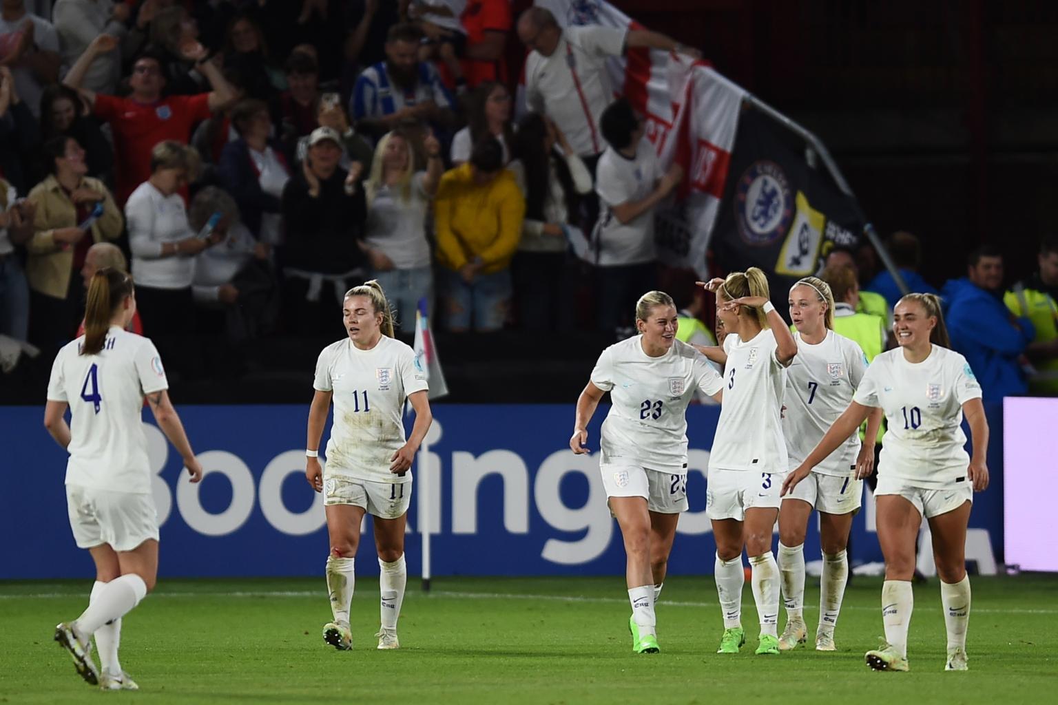 England's women's football team celebrate after scoring a goal against Sweden in the Euro semi-final match on July 26, 2022.