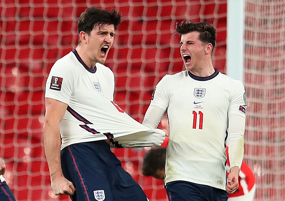 England's Harry Maguire celebrates scoring their second goal with Mason Mount.