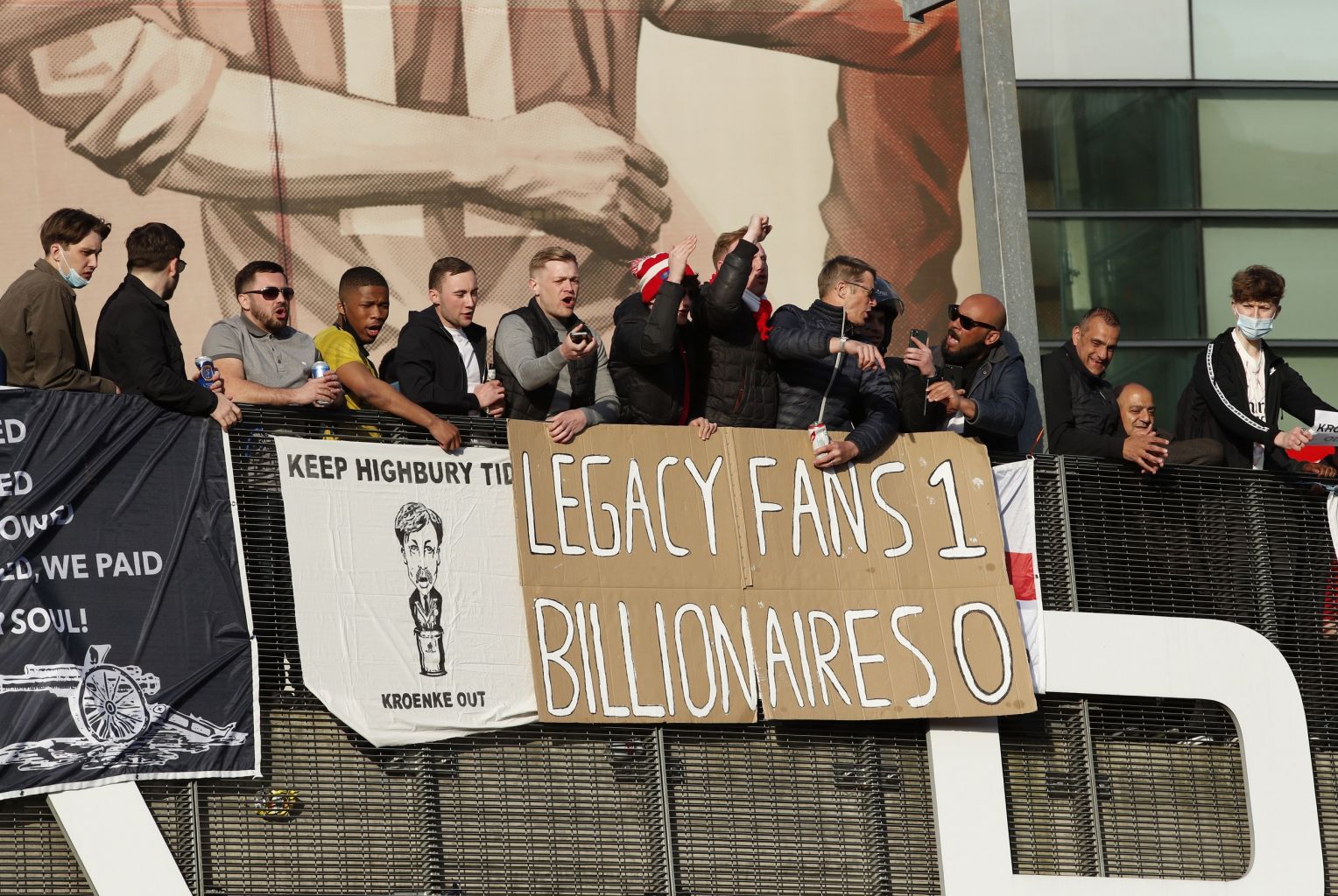 Arsenal fans protest against the club's owner after the failed launch of a European Super League, at Arsenal's Emirates Stadium in London.
