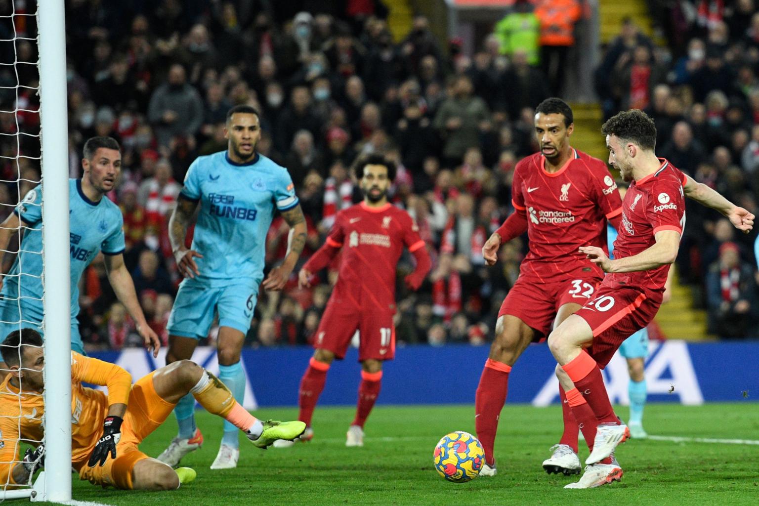 Liverpool's Diogo Jota (right) shooting the first goal during the Liverpool and Newcastle United match in England on Dec 16, 2021.