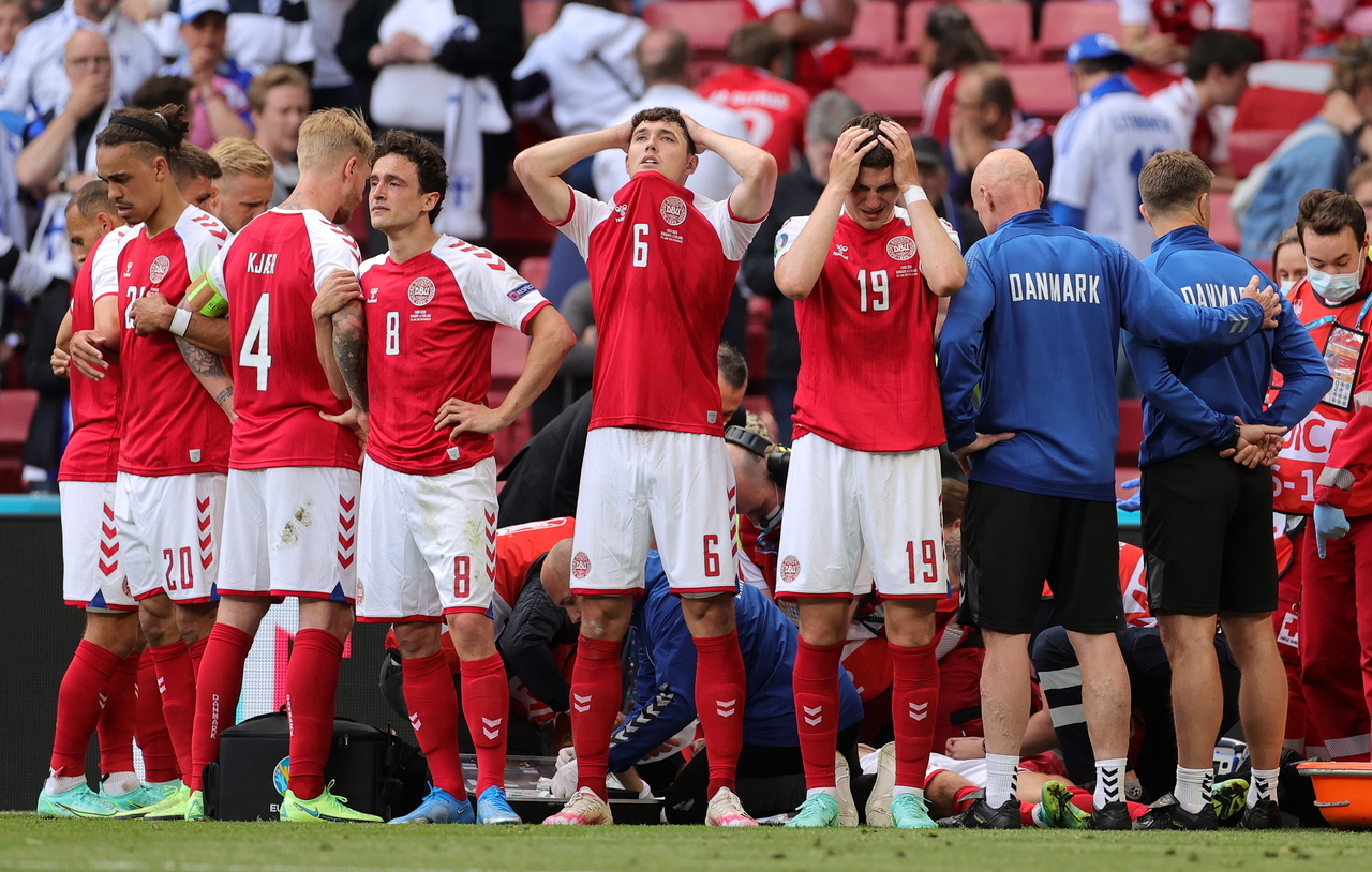 Players of Denmark react while their teammate Christian Eriksen receives medical treatment during the soccer match between Denmark and Finland in Copenhagen on June 12, 2021.