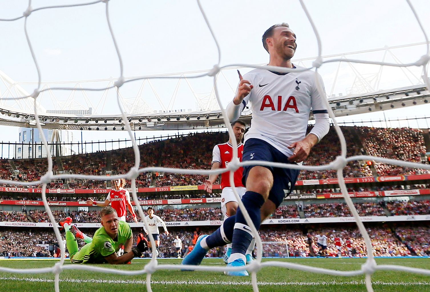Eriksen celebrates scoring a goal for Tottenham against Arsenal.