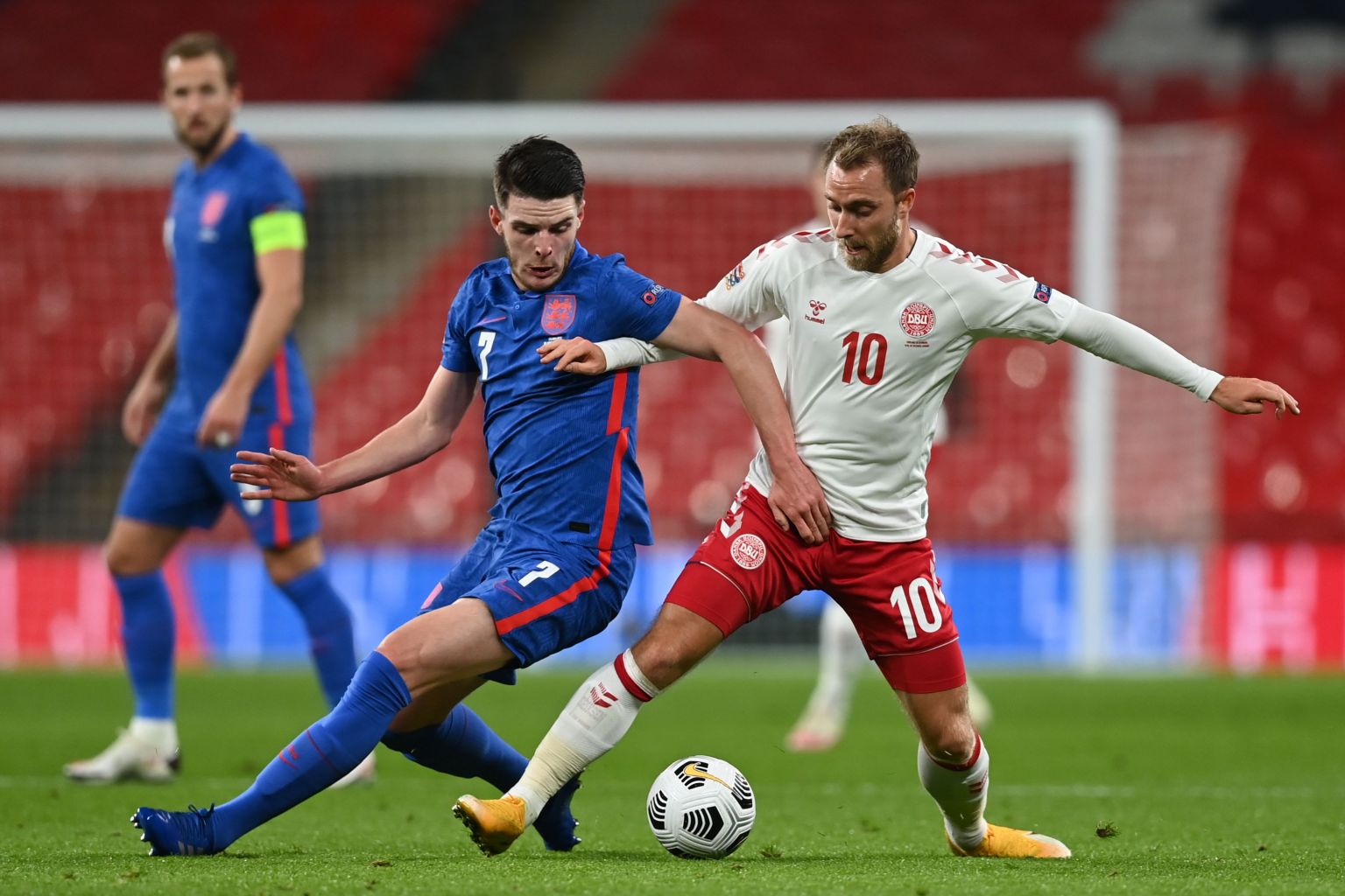 England's Declan Rice (left) vies with Denmark's Christian Eriksen.