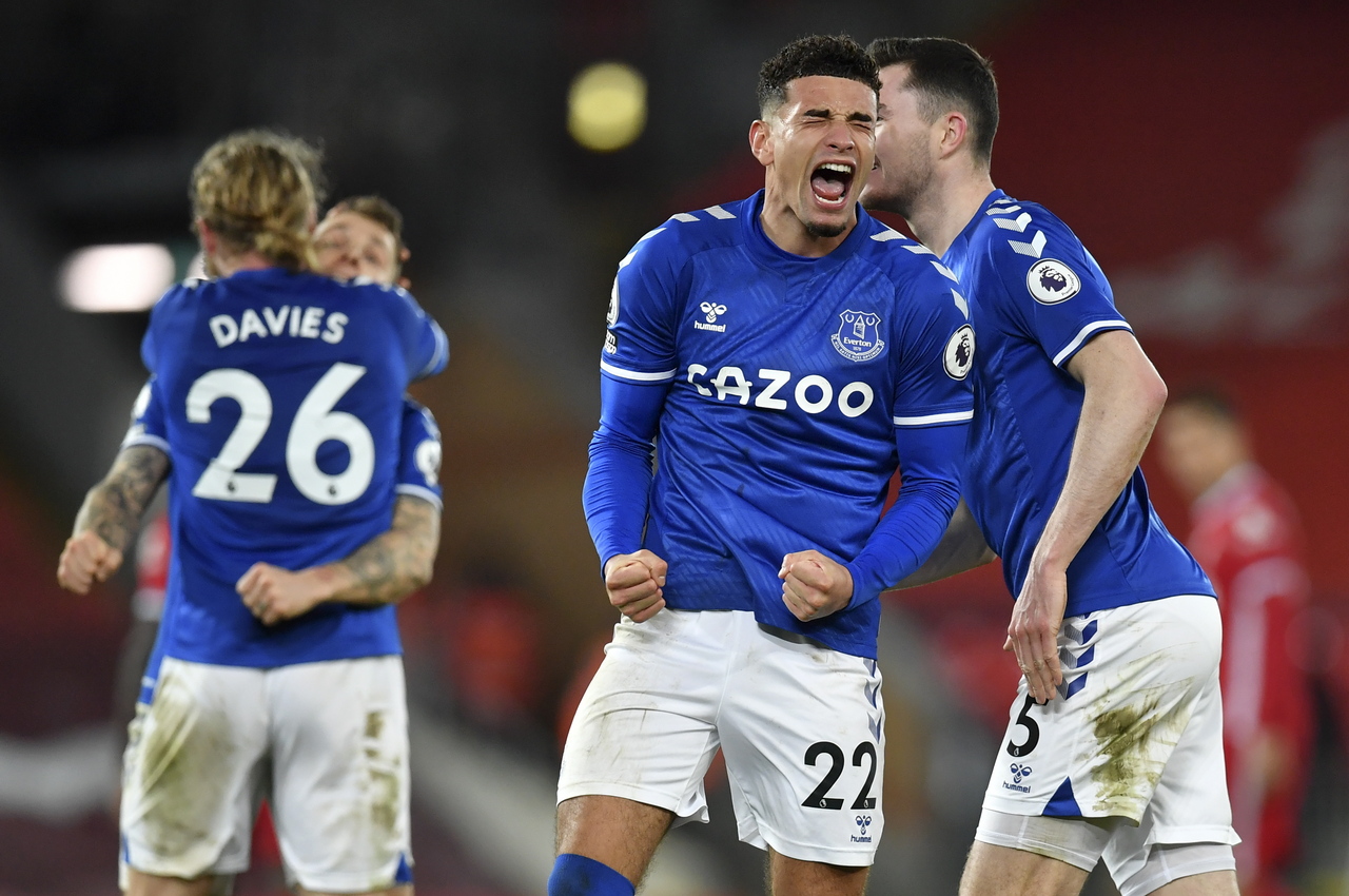 Everton's Ben Godfrey (centre) and his teammates celebrate after winning the match against Liverpool on Feb 20, 2021.