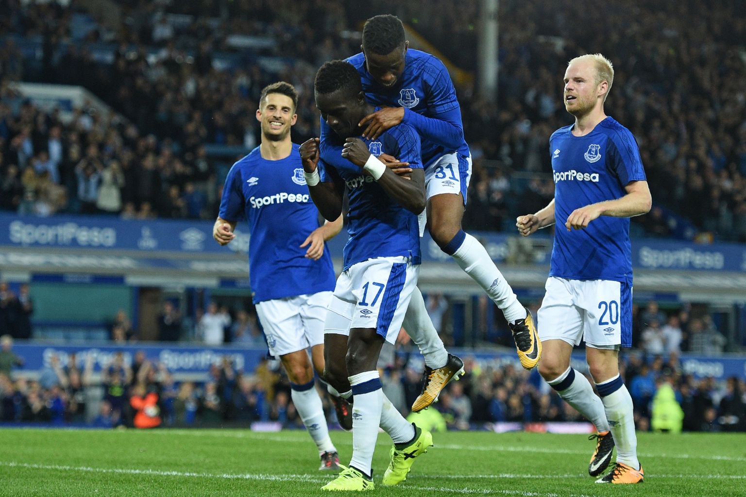 Everton's Idrissa Gueye celebrates with teammates after scoring their second goal.