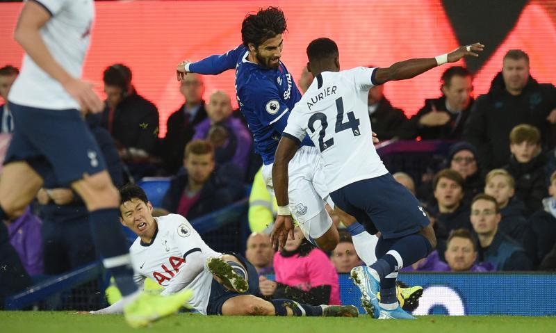 Everton midfielder André Gomes (centre) gets caught by Tottenham Hotspur striker Son Heung-min (left) leading to an injury to Gomes during the EPL football match between Everton and Tottenham Hotspur in Liverpool, on Nov 3, 2019.