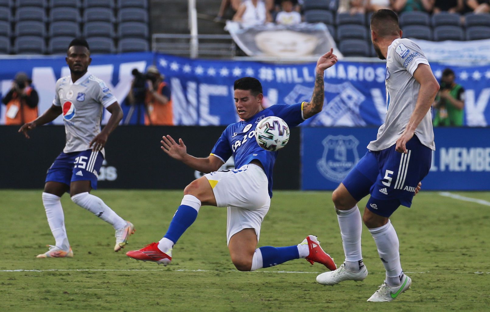 Everton's James Rodriguez in action for the club (centre) against Millonarios in the US, in July 2021.