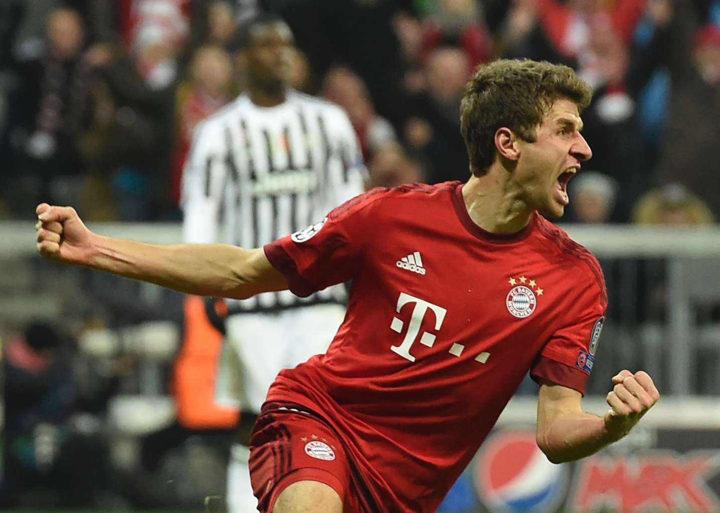 Bayern Munich's midfielder Thomas Mueller celebrates scoring the 2-2 goal.