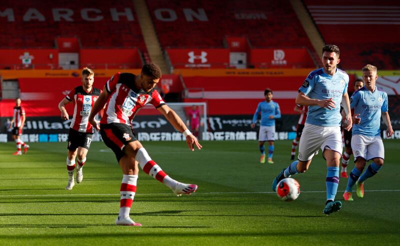 Southampton midfielder Che Adams (left) shoots at goal during the match against Manchester City on July 5, 2020.