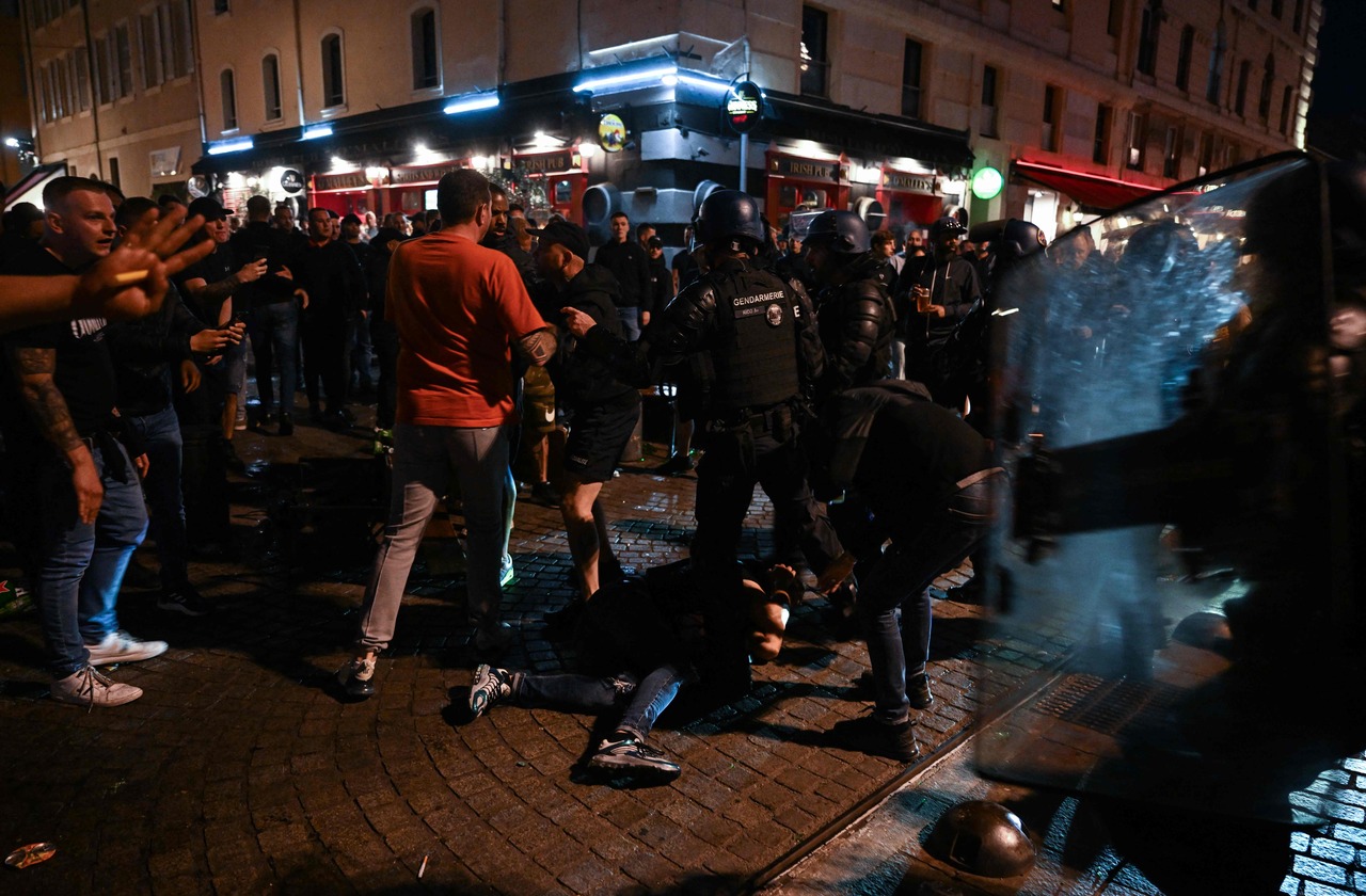 French gendarmes intervene as supporters clash in the Old Port of Marseille, southern France, on May 4, 2022.